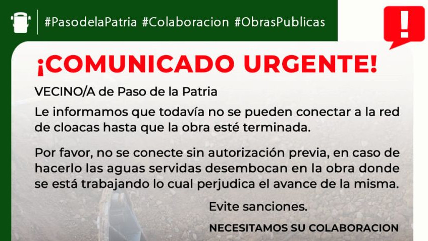 La Municipalidad de Paso de la Patria desea informar a los residentes que actualmente no se encuentran disponibles las conexiones a la red de cloacas, ya que la obra correspondiente aún no ha sido finalizada.
