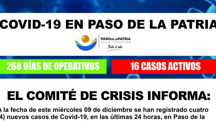 A la fecha de este miércoles 09 de diciembre se han registrado cuatro (4) nuevos casos de Covid-19 en las últimas 24 horas, en Paso de la Patria.