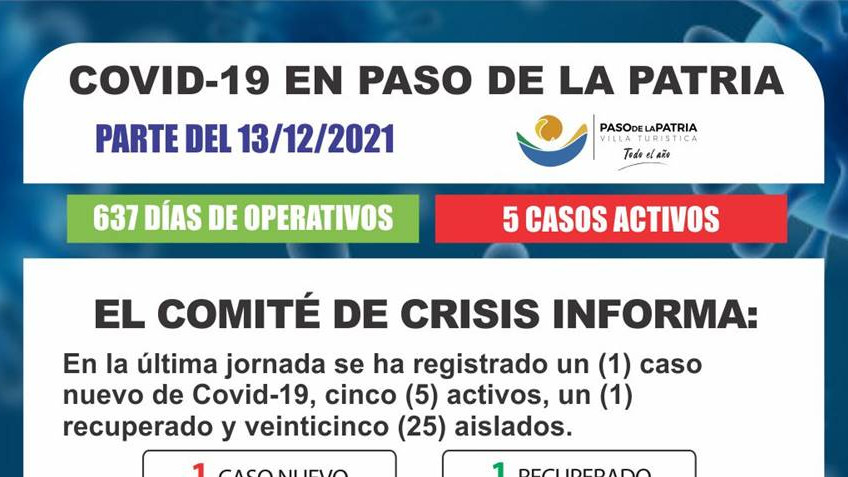 En las últimas 24 horas se ha registrado un (1) caso nuevo de Covid-19, un (1) recuperado, cinco (5) casos activos y veinticinco (25) personas están aisladas preventivamente en Paso de la Patria.