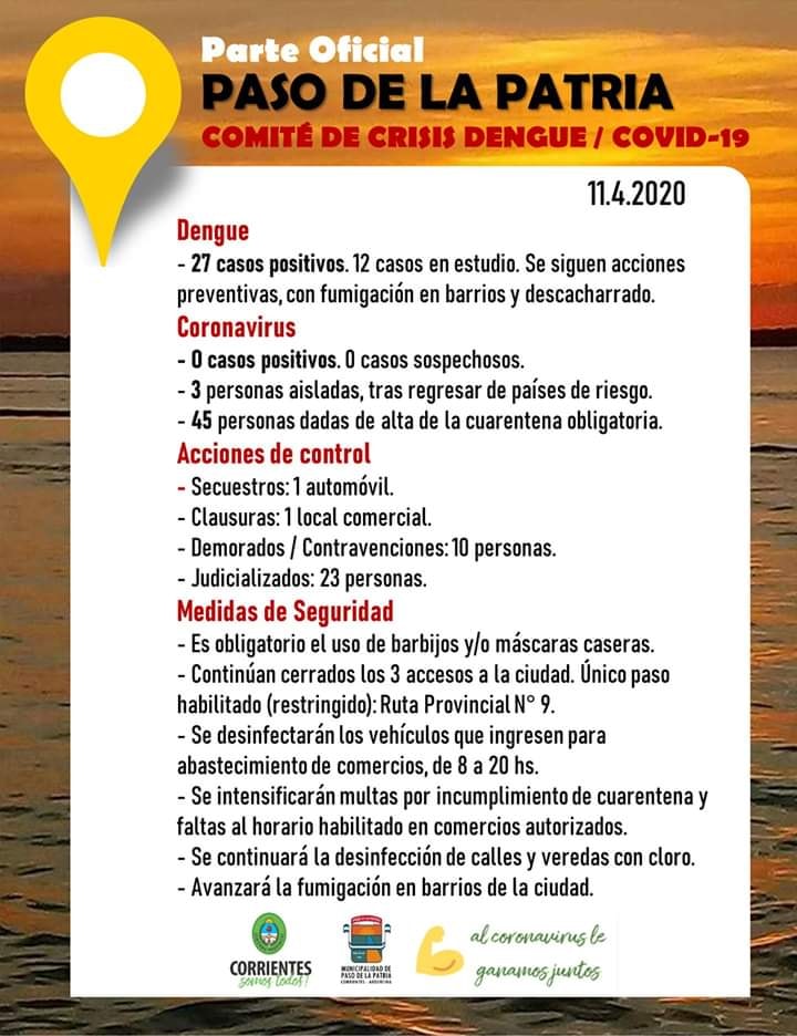 El Comité de Crisis Dengue / Covid-19 de Paso de la Patria ha publicado su comunicado oficial de la fecha.