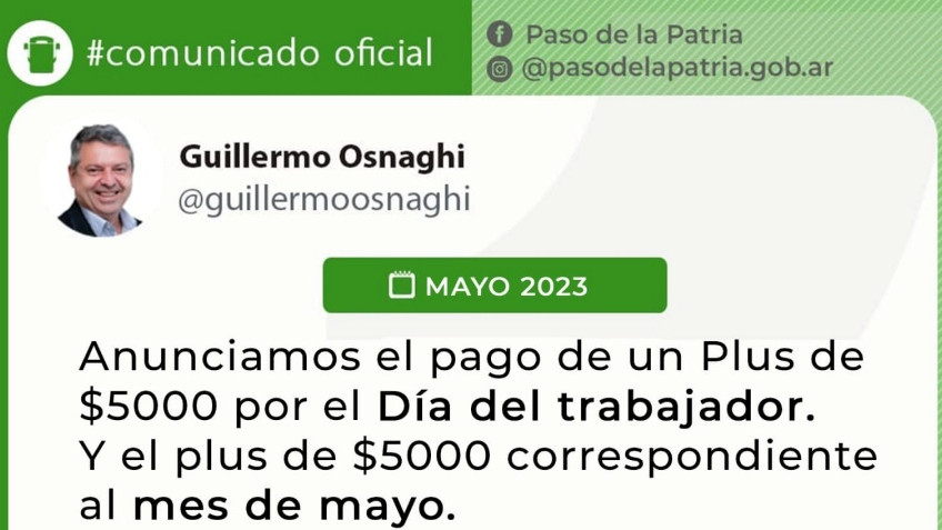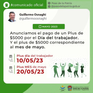 Este 1 de mayo de 2023, el intendente de Paso de la Patria Guillermo Osnaghi envió un mensaje de salutación a todos los trabajadores en general y a los trabajadores municipales en particular. Ver el video del mensaje.