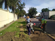 Sobre calle La Rioja se realiza nivelación de vereda de suelo natural y colocación de césped, el objetivo es el mejoramiento del espacio para tránsito de peatones en esa importante arteria de acceso.