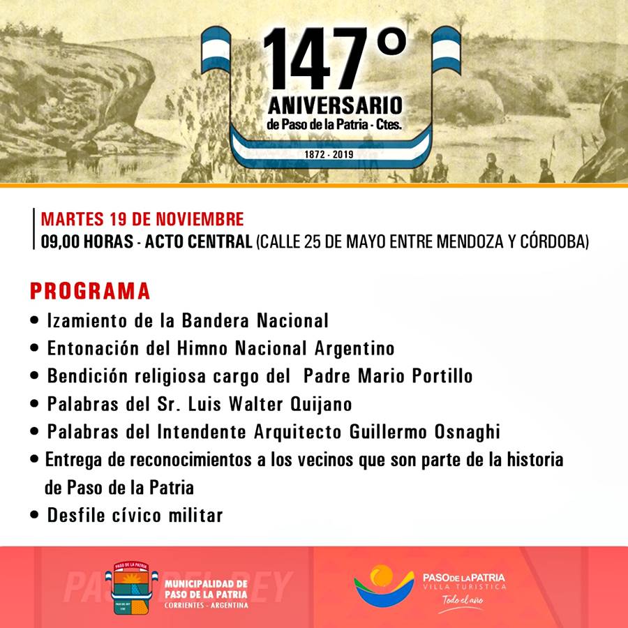 El Sr. Intendente, Arq. Guillermo Osnaghi, extiende una cordial invitación a toda la población de la Villa Turística Paso de la Patria a participar del Acto Central de Conmemoración del 147° Aniversario de la Fundación de la localidad con el Nombre “Paso de la Patria”.