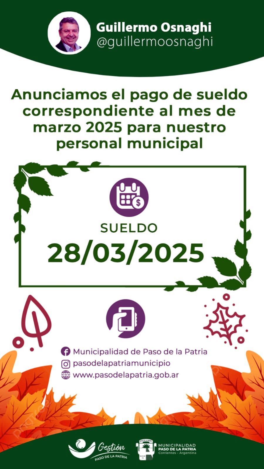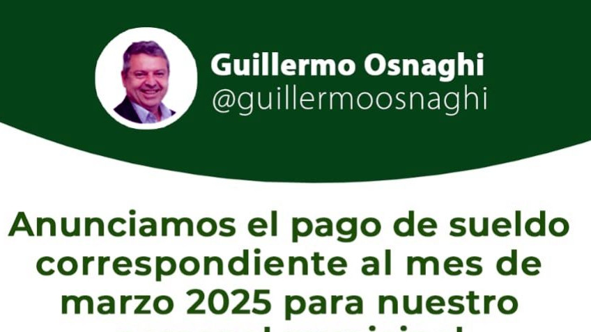 El Arq. Guillermo Osnaghi, Intendente de la Municipalidad de Paso de la Patria, anuncia oficialmente la fecha de pago de los sueldos correspondientes al mes de marzo de 2025 para todos los trabajadores municipales.