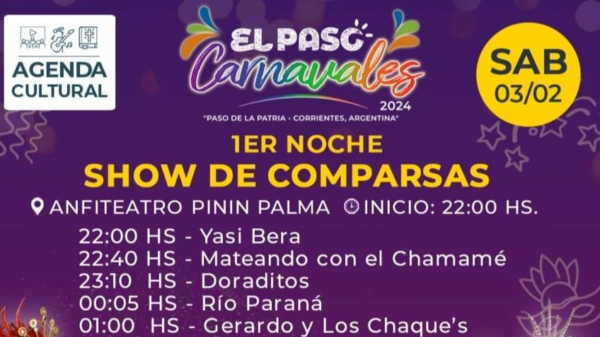 La velada comenzará este sábado 3 de febrero, a las 22 horas, con la presentación de Yasí Berá, la renombrada Comparsa de San Luis del Palmar con todo su esplendor. A continuación, la Agrupación Tradicionalista local, Mateando con el Chamamé, nos transportará con su música y danzas típicas a las tradiciones más arraigadas de la región.