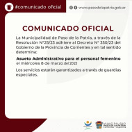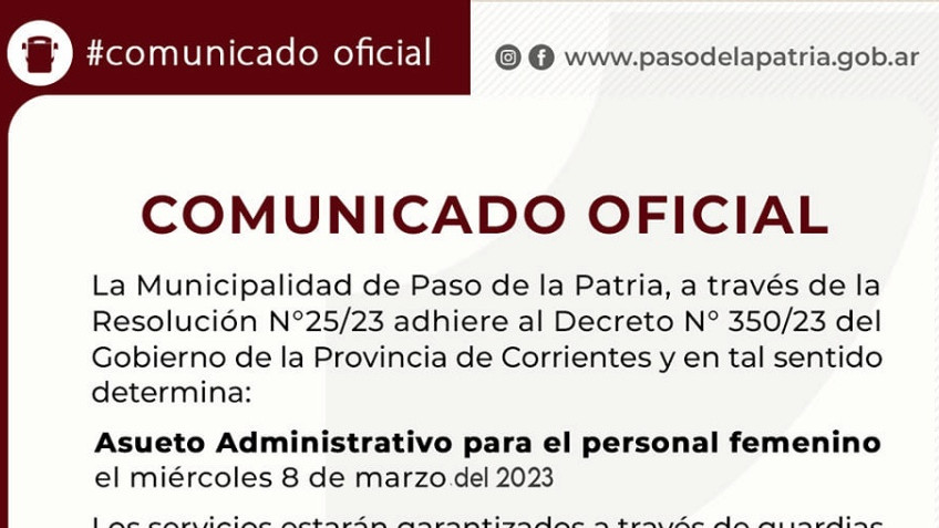 Comunicado Oficial: La Municipalidad de Paso de la Patria, por Resolución N° 25/2023 adhiere al Decreto 350/2023 del Gobierno de la Provincia de Corrientes y en ese sentido determina “Asueto Administrativo para el personal femenino este miércoles 8 de marzo de 2023”.