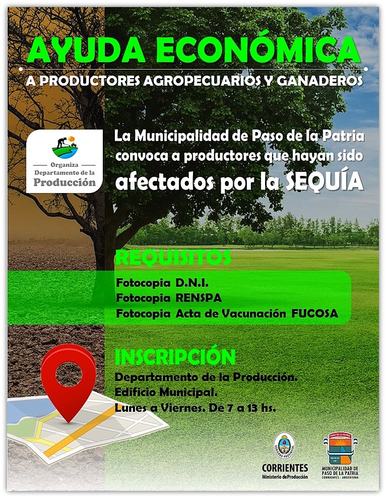 La Municipalidad de Paso de la Patria, a través del departamento de la Producción, llama a productores agropecuarios y ganaderos de la localidad a inscribirse para gestionar una ayuda económica del Ministerio de la Producción.