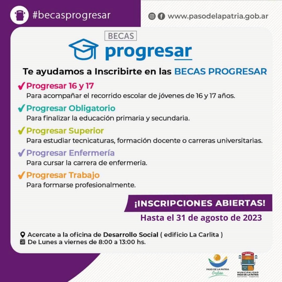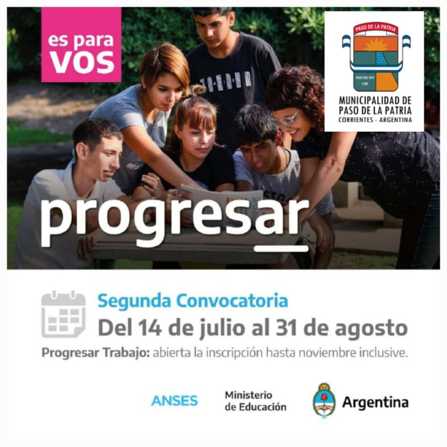 Desde la Oficina de Desarrollo Social de la Municipalidad de Paso de la Patria se comunica a todos los vecinos que se encuentra abierta la inscripción al segundo llamado del Programa de Respaldo a Estudiantes Argentinos (PROGRESAR), en las cuatro líneas: nivel obligatorio, superior, enfermería y trabajo.
