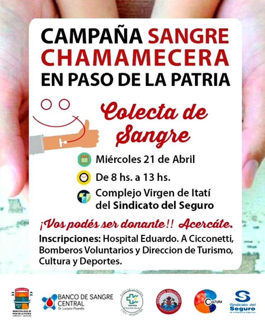 Colecta de sangre “Sangre Chamamecera” el próximo miércoles 21 de abril en Paso de la Patria.