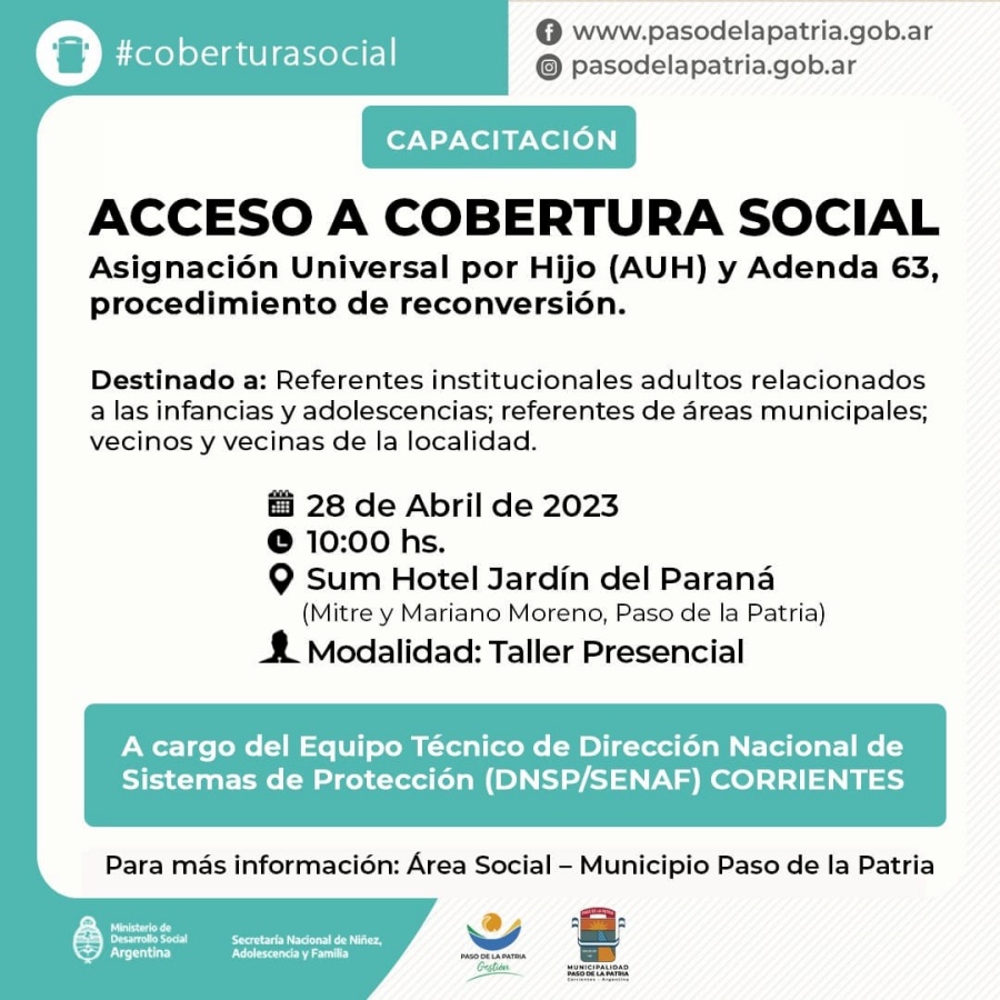 Este taller sobre Acceso a Cobertura Social es de modalidad presencial, tendrá lugar en el SUM del hotel Jardín del Paraná (Mitre esq. Moreno), el día viernes 28 de abril, a las 10 horas. Está a cargo del Equipo Técnico de Dirección Nacional de Sistemas de Protección (DNSP/SENAF) Corrientes.