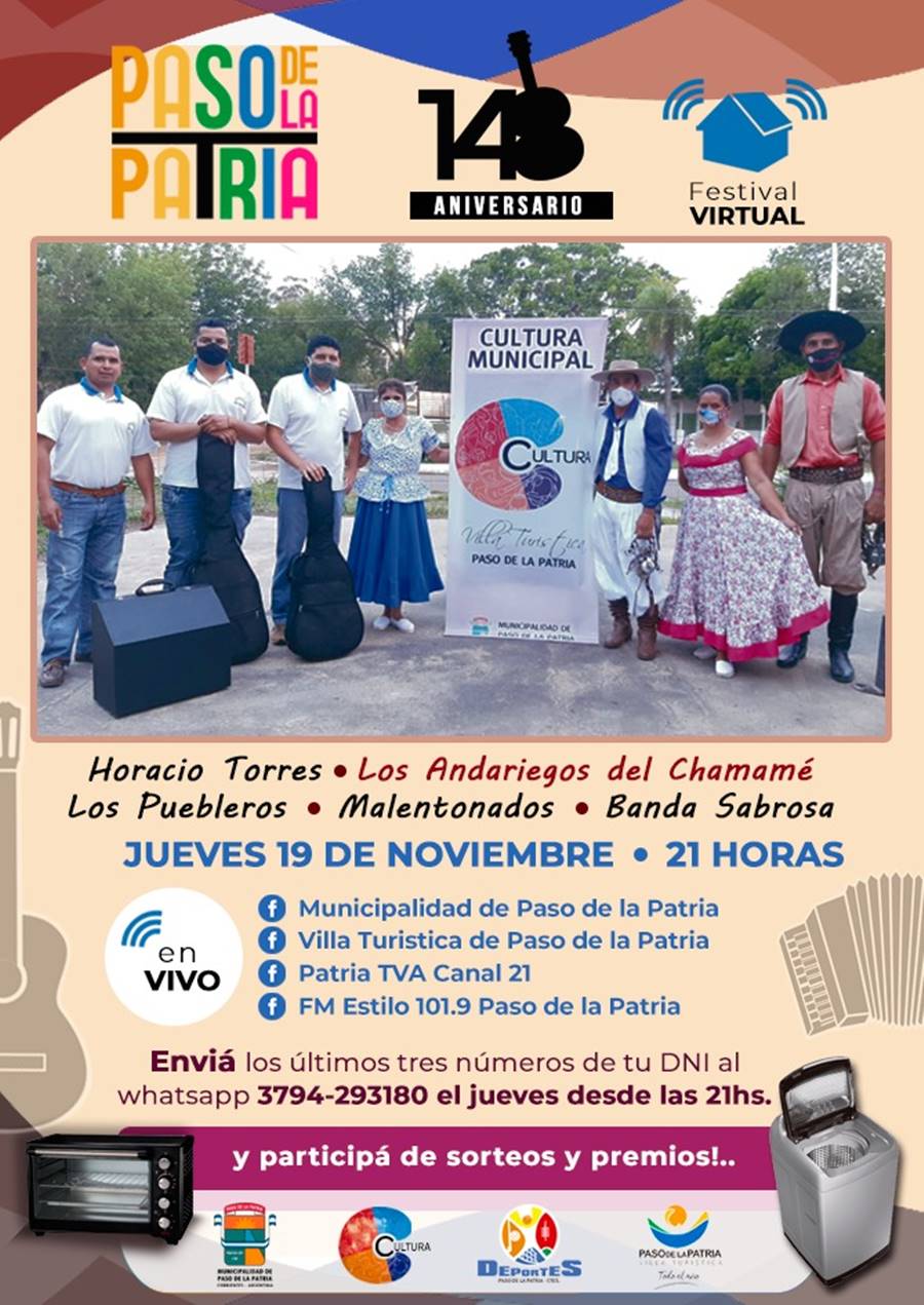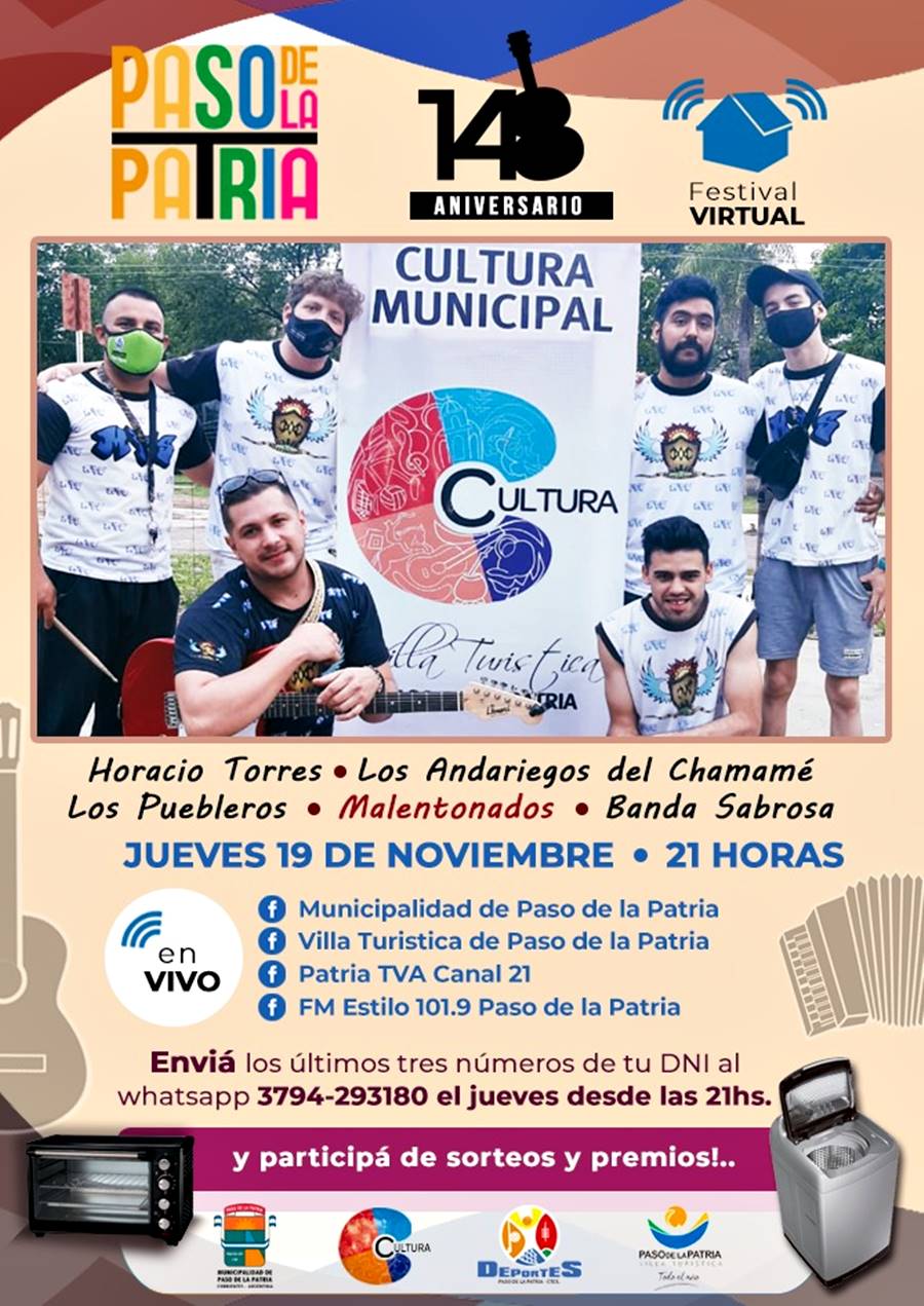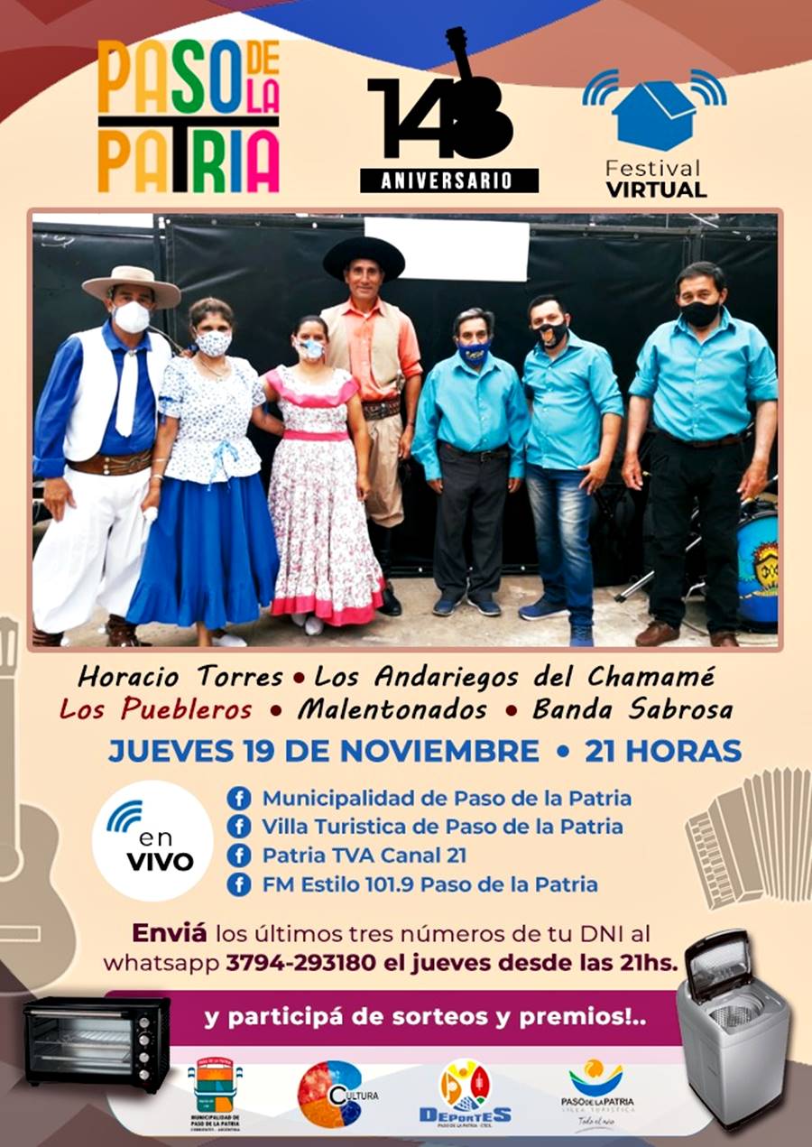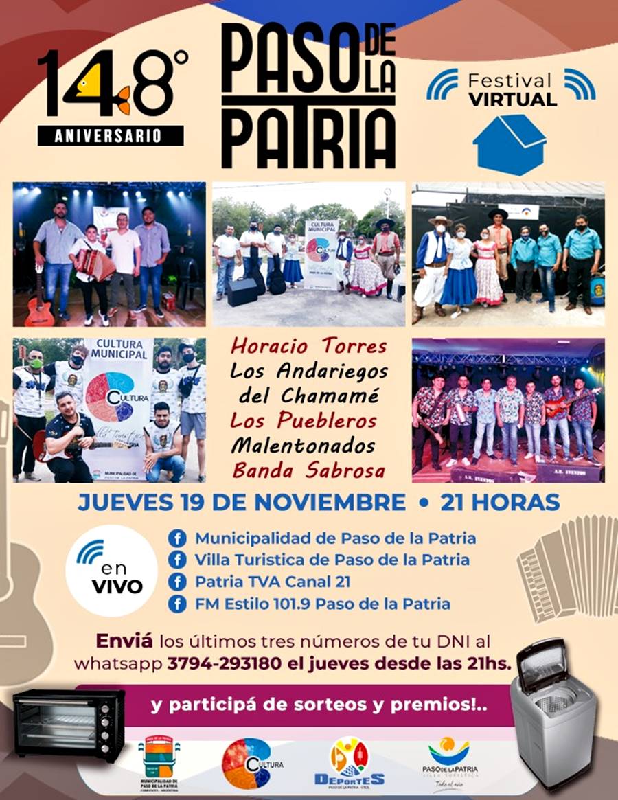 Va a pasar que el jueves 19 de noviembre a las 21 horas comenzará el “Festival Virtual” organizado por el Departamento de Cultura de la municipalidad de Paso de la Patria. Se proyectará a través de las páginas de Facebook “Municipalidad de Paso de la Patria” y “Villa Turística Paso de la Patria”, en directo por Canal 21 de Patria TVA y en directo por Radio Estilo FM 101,9 de Paso de la Patria.