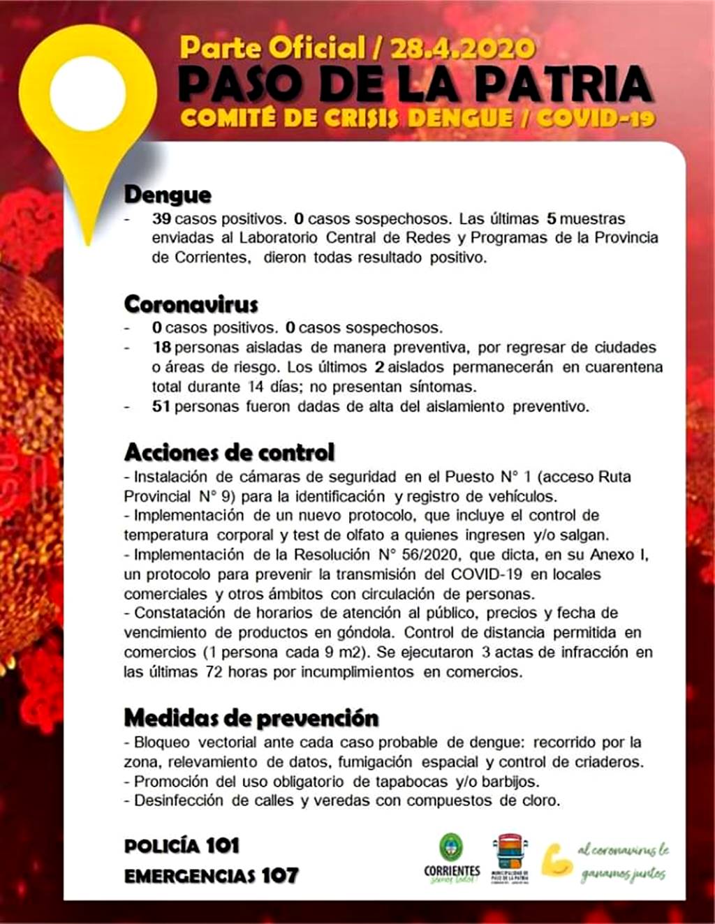 El Comité de Crisis de Paso de la Patria para Dengue y Coronavirus dio a conocer el siguiente Parte Oficial correspondiente a este martes 28 de abril de 2020.