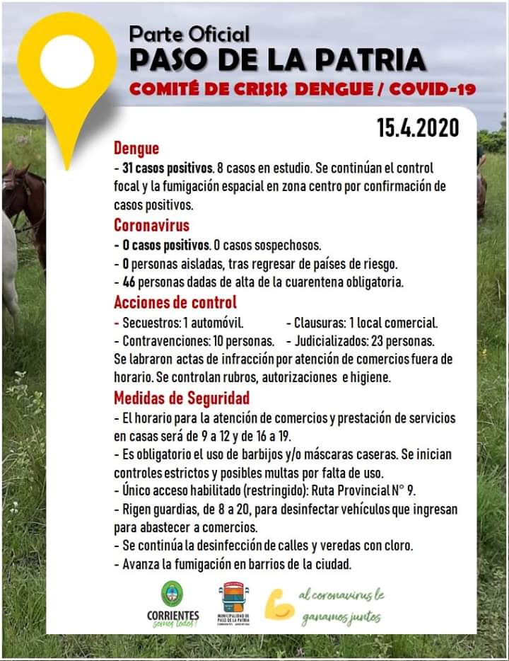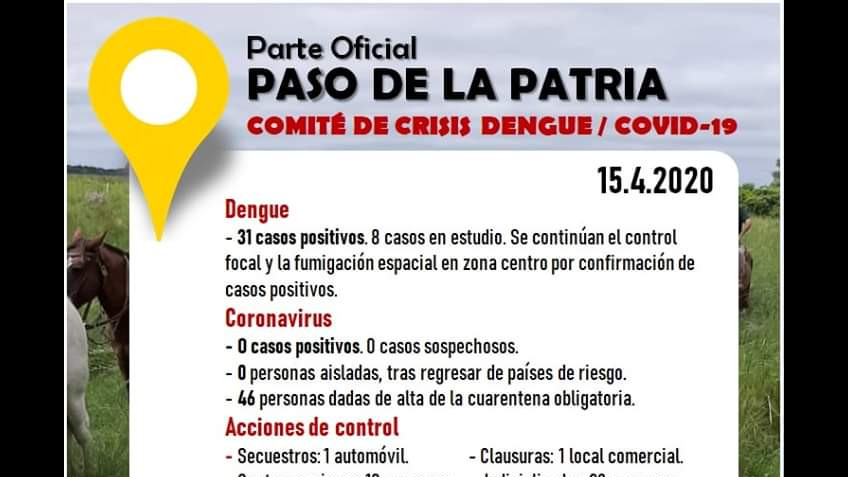 No existen casos de Coronavirus en Paso de la Patria, no hay casos sospechosos, ni personas aisladas por haber regresado de países en riesgo, hasta el momento de publicación de este informe. Hay 46 personas dadas de alta de cuarentena obligatoria.