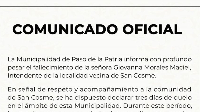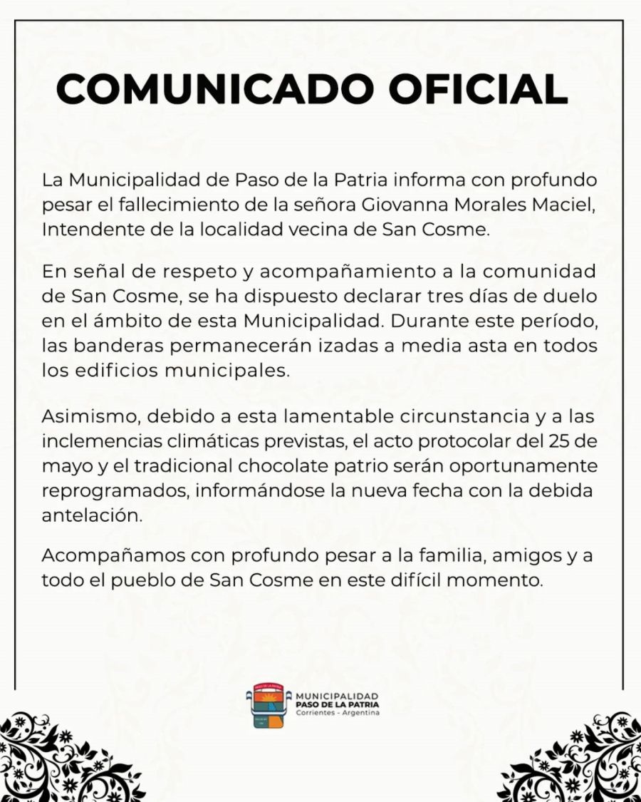 La Municipalidad de Paso de la Patria informa con profundo pesar el fallecimiento de la señora Giovanna Morales Maciel, intendente de la localidad vecina de San Cosme.