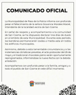 En señal de respeto y acompañamiento a la comunidad de San Cosme, se ha dispuesto declarar tres días de duelo en el ámbito de esta Municipalidad. Durante este periodo, las banderas permanecerán izadas a media asta en todos los edificios municipales.