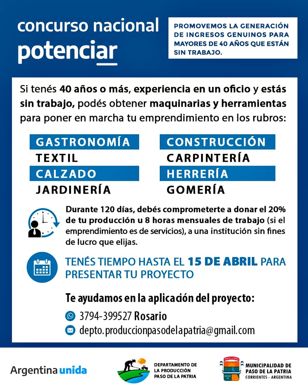 Te ayudamos a presentar tu proyecto. Comunicate con la Jefe del Departamento de Producción Municipal Rosario Montiel al 379 4399527 o al mail depto.produccionpasodelapatria@gmail.com