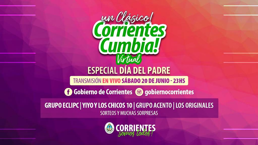 Actuarán Eclip’C, Yiyo y Los Chicos 10, Grupo Acento y Los Originales. El evento será transmitido en vivo a través de las redes sociales de 23 a 1. Bajo modalidad virtual, el programa Corrientes Cumbia agasajará este sábado 20 a todos los padres correntinos con importantes bandas locales.
