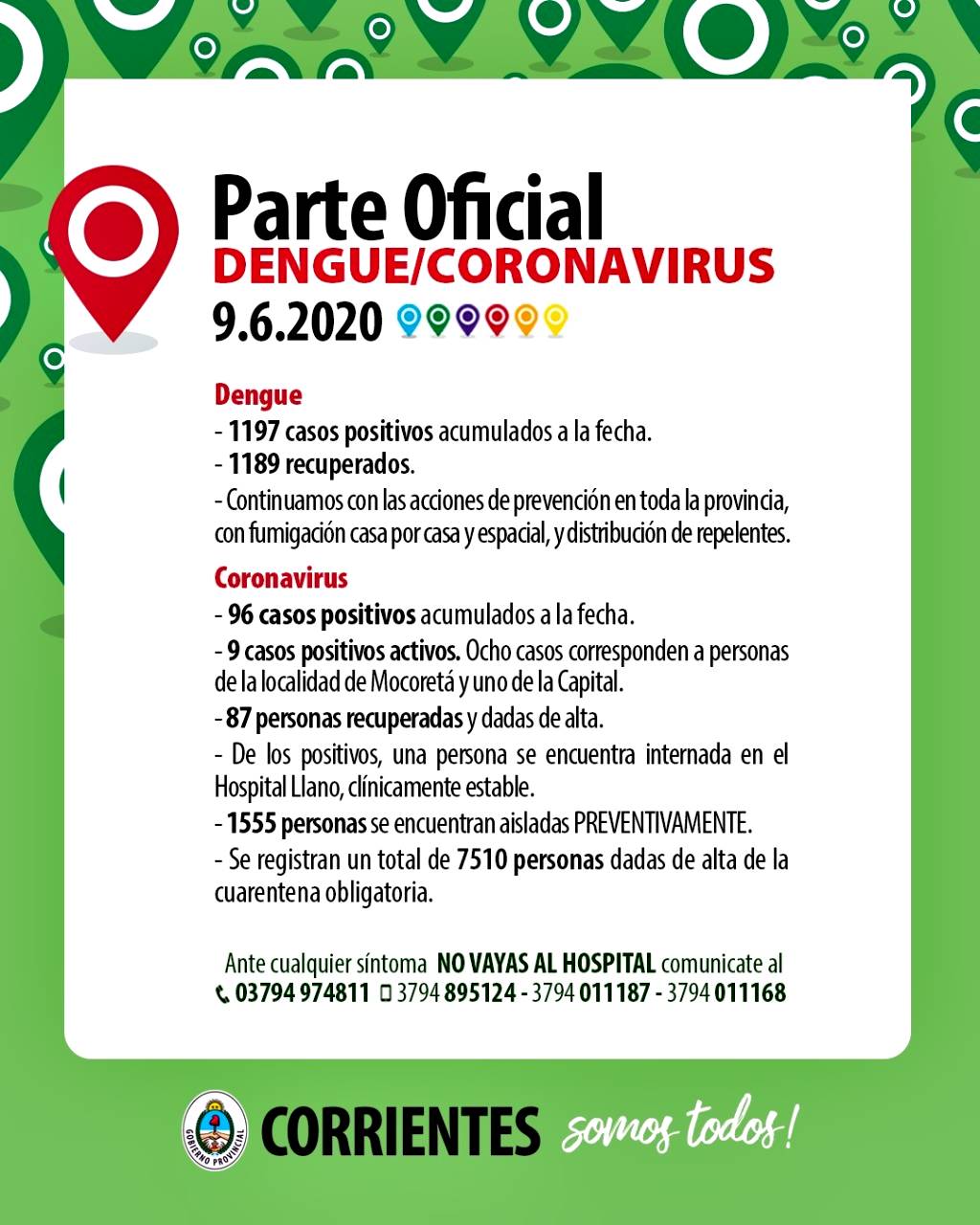 Hay 9 casos activos, uno de ellos internado en el hospital Llano, en condición clínica estable, 7 son de la localidad de Mocoretá y 1 de Capital, quienes se recuperan aislados en sus domicilios. Se encuentran en aislamiento preventivo 1555 personas y han concluido esa condición de aislamiento 7510.