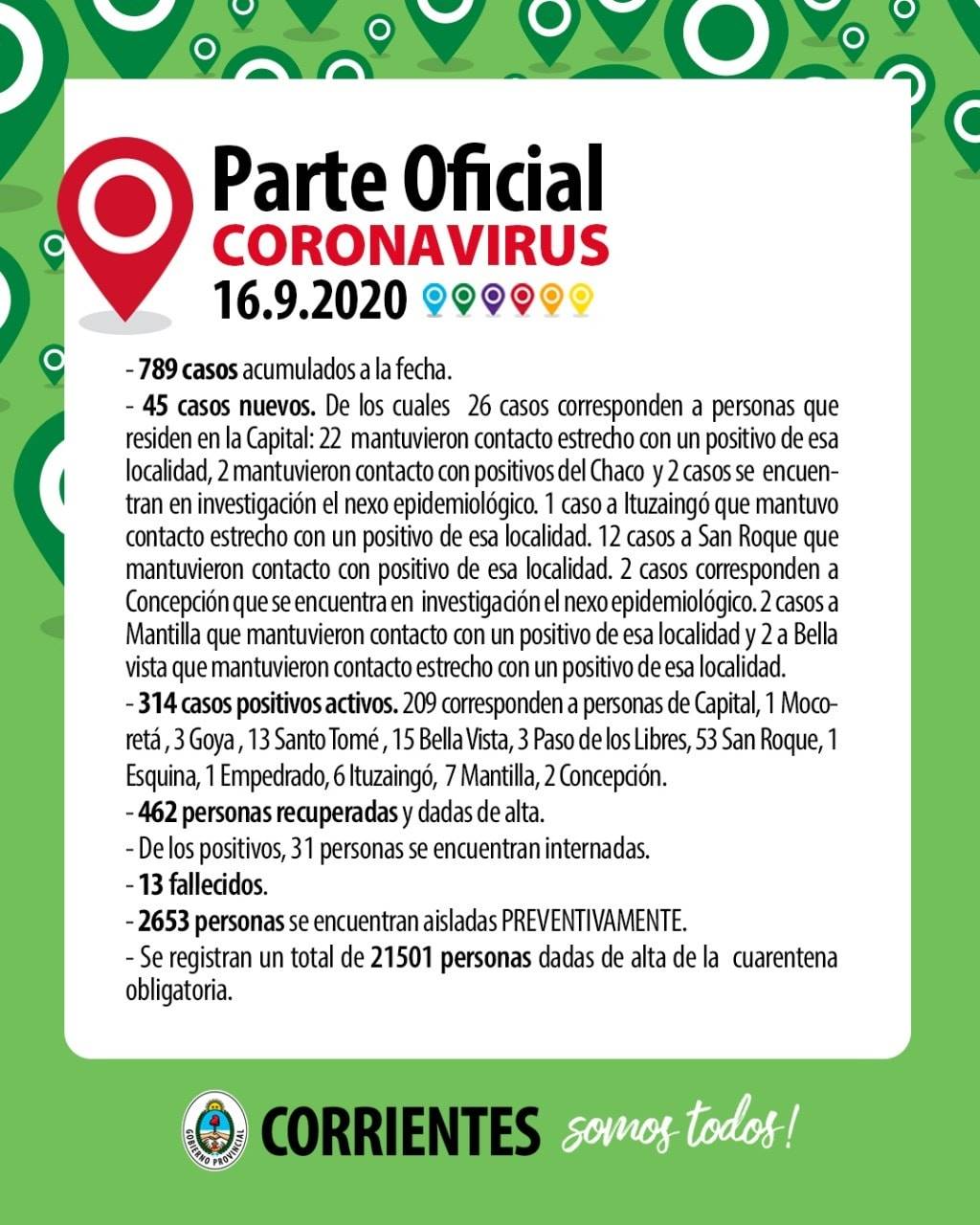 Covid-19: Corrientes suma hoy 45 casos nuevos, 314 positivos y 13 fallecidos.