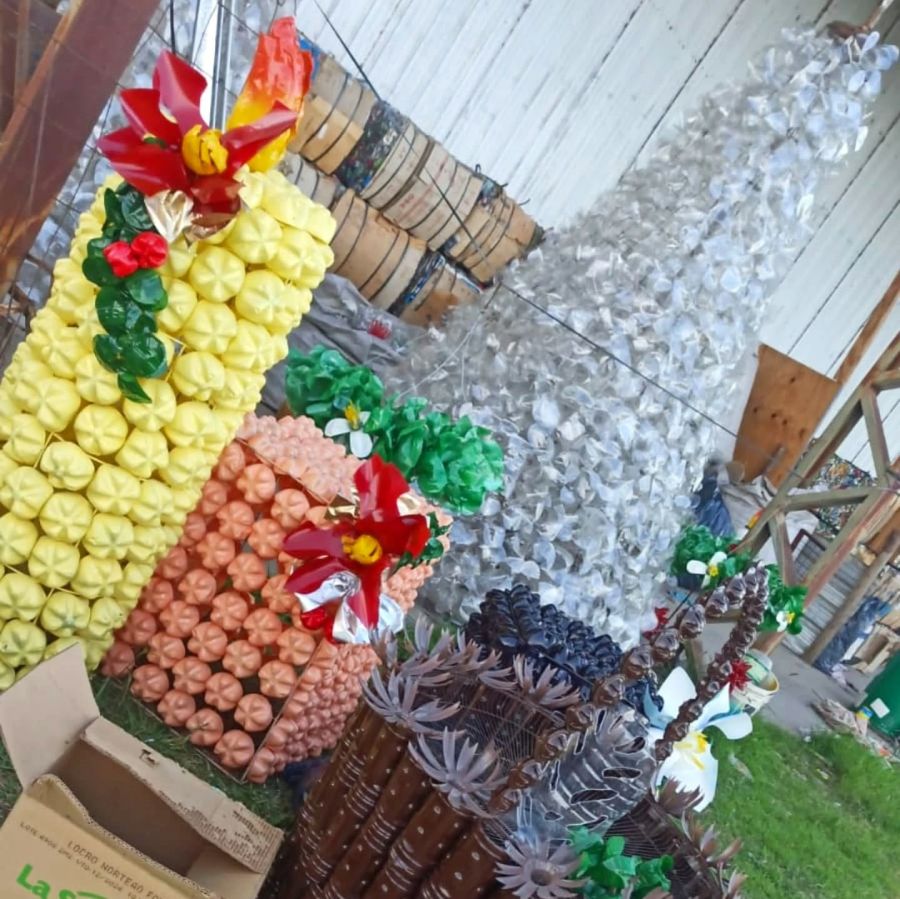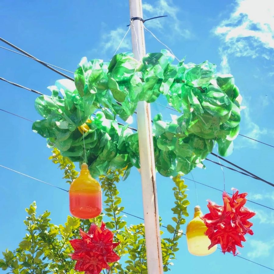 Estos adornos, realizados con materiales 100% reciclados, utilizan plásticos de botellas PET que han sido recolectadas y reutilizadas de manera ingeniosa. Esta iniciativa no solo embellece nuestra comunidad, sino que también representa un firme compromiso con la protección del medio ambiente.