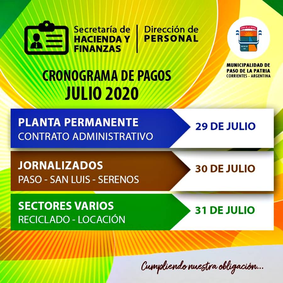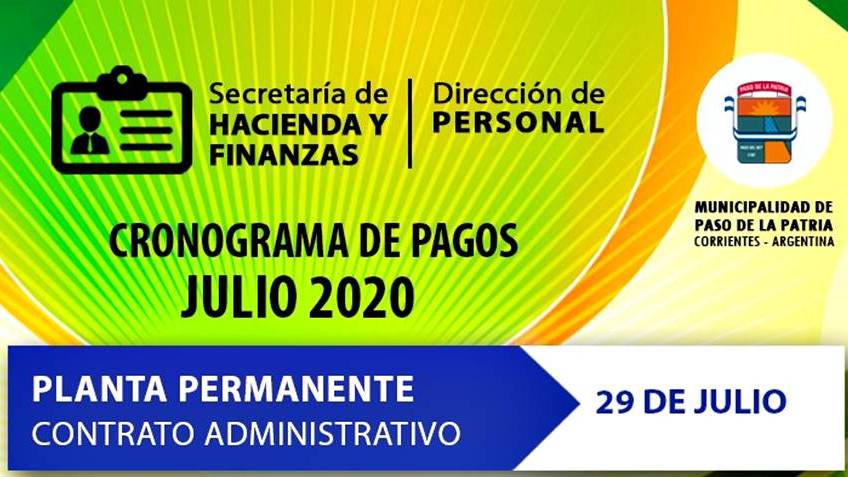 La Municipalidad de Paso de la Patria, a través de la Secretaría de Hacienda y Finanzas, informa de manera oficial el cronograma de pagos correspondiente al mes de Julio, para empleados municipales.