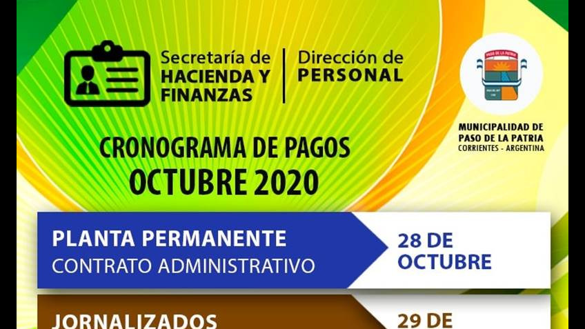 Sueldos de octubre. La Municipalidad de Paso de la Patria anuncia el cronograma de pagos al personal municipal.