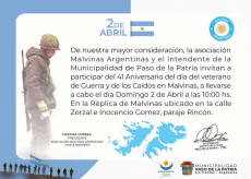 El Intendente de la Municipalidad de Paso de la Patria Arq. Guillermo Osnaghi y la Presidente de la Asociación Malvinas Argentinas Punta Montero Sra. Cristina Correa, invitan a toda la comunidad a participar del acto por el 41 Aniversario del Día del Veterano y de los Caídos en la guerra de Malvinas.