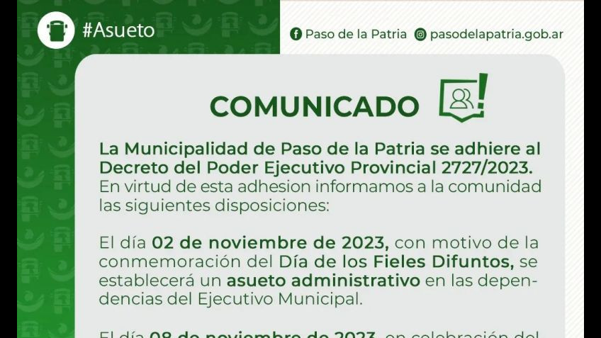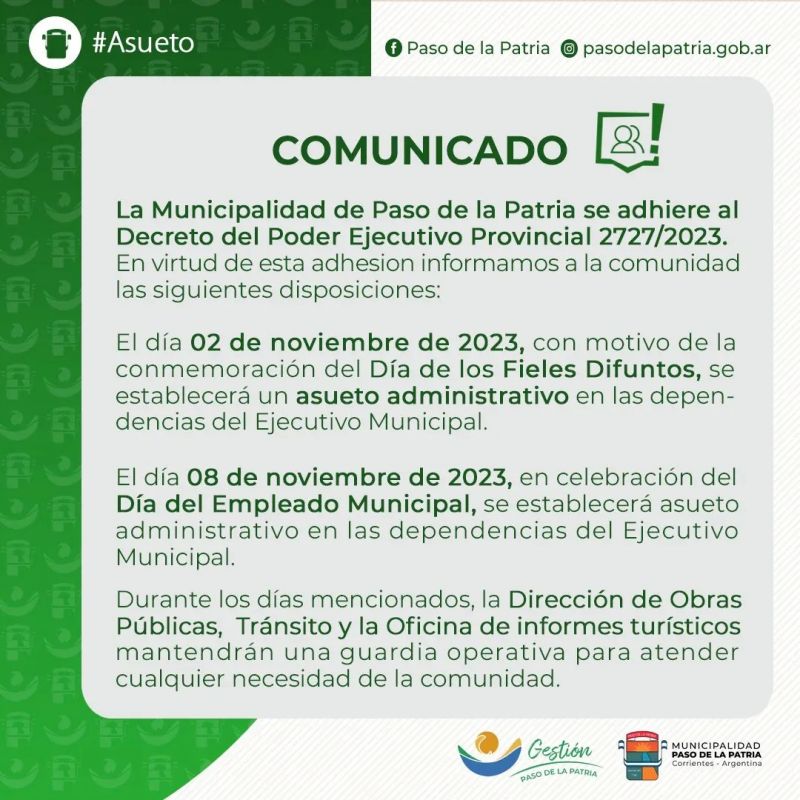 La Municipalidad de Paso de la Patria desea informar a la comunidad que se ha adherido al Decreto del Poder Ejecutivo Provincial 2727/2023, y en virtud de esta adhesión, se establecen las siguientes disposiciones: