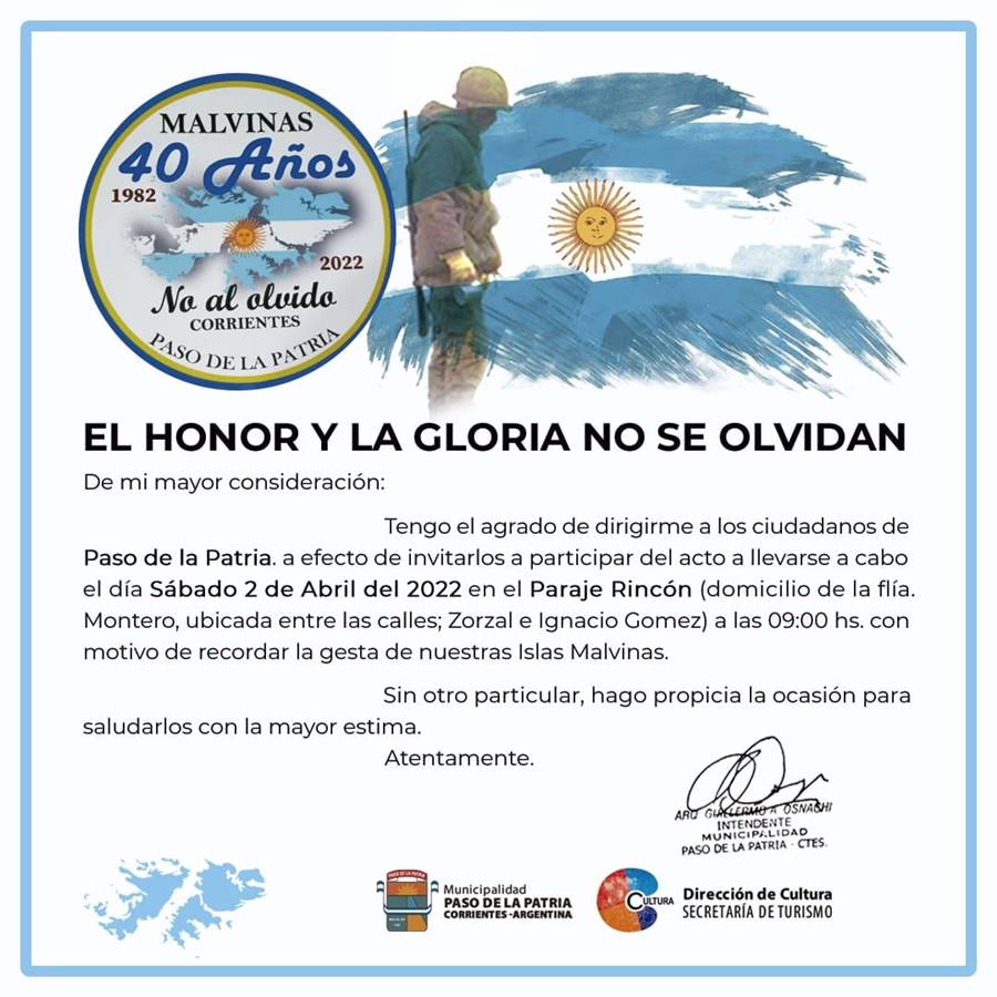 El intendente de la Municipalidad de Paso de la Patria, Guillermo Osnaghi, invita a los ciudadanos de la localidad a participar del acto a realizarse este sábado 2 de abril en Paraje Rincón, domicilio de la familia Montero, ubicada entre calle Zorzal e Ignacio Gómez a las 9 horas con motivo de recordar la gesta de nuestras Islas Malvinas.