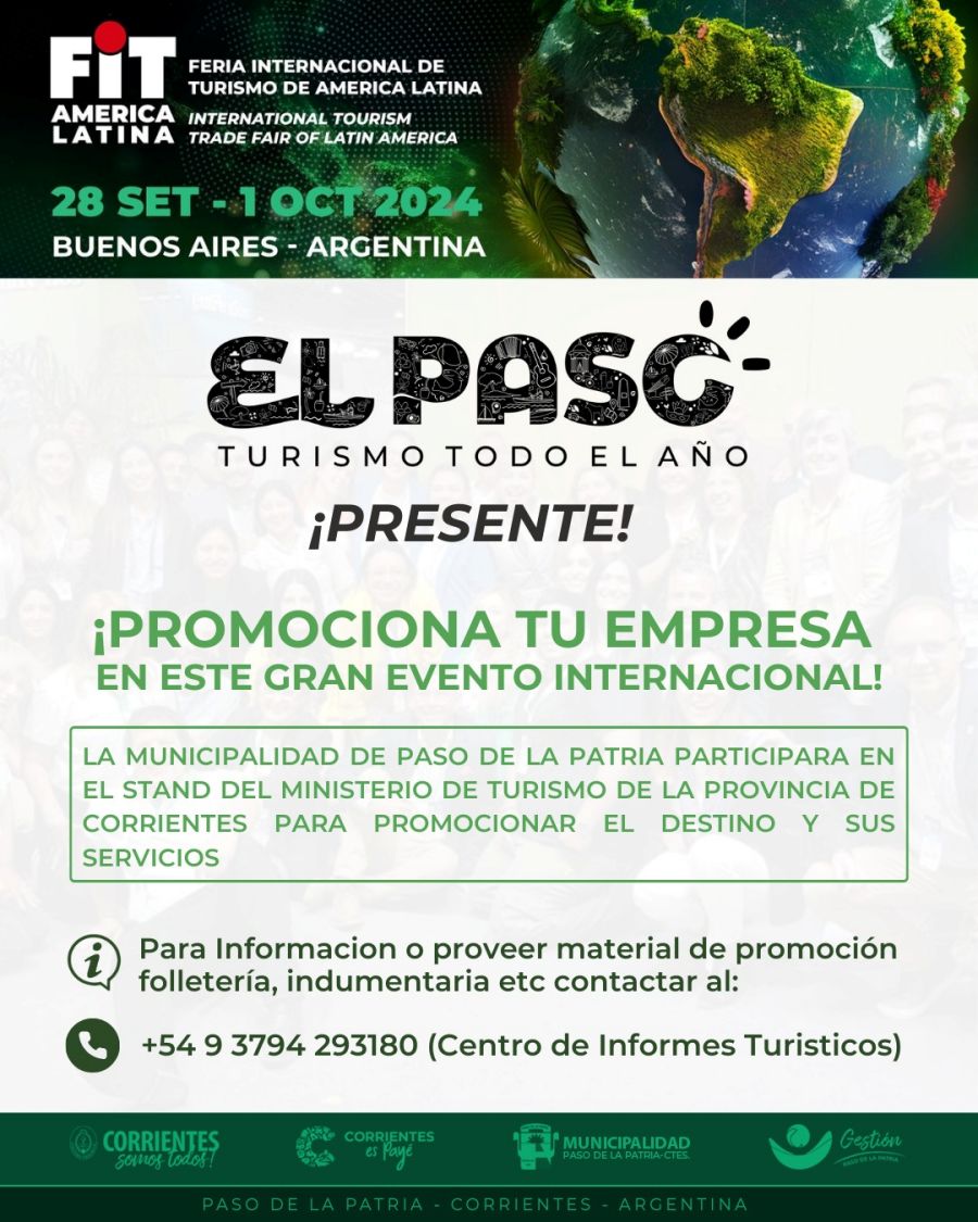 Durante la feria, mostraremos a toda América Latina y al resto del país los atractivos únicos de Paso de la Patria, desde sus paisajes naturales hasta sus actividades culturales y recreativas. ¡No te pierdas la oportunidad de destacar lo mejor de nuestro destino en este importante encuentro!