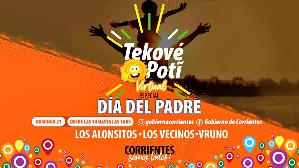 Está todo preparado para que el regreso del  Tekové Potí, sea extraordinario, y vuelva a mostrar que se trata de una propuesta arraigado en la comunidad correntina, que integra a todos los sectores de la comunidad, con múltiples actividades, a la vez que está llamada en esta nueva forma de comunicarse, de manera virtual, en una gran posibilidad para las familias que quieran protagonizar diferentes actividades sociales y recreativas y aunque sea por momentos dejar atrás lo negativo que ha generado  la Pandemia. La propuesta es el domingo de 14 a 16, por las redes sociales del Gobierno y libre para todos los canales que decidan tomar la señal, para celebrar juntos el Día del Padre, pero anticipan que esto es solo el inicio, porque se vienen nuevos eventos.