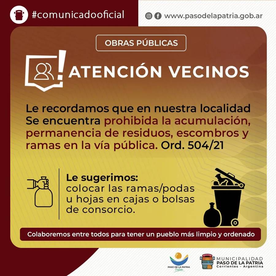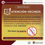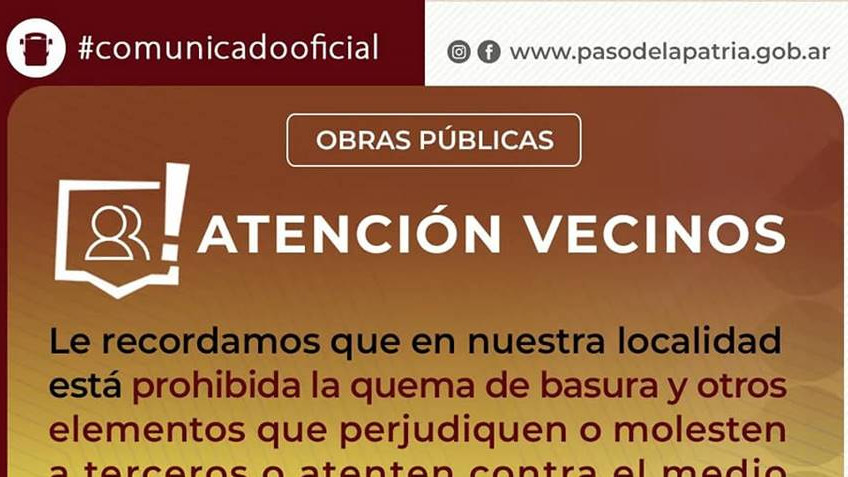 La Municipalidad de Paso de la Patria recuerda que se encuentra prohibida la quema de basura u otros elementos, conforme a las normas vigentes, Ordenanza 456/2020.