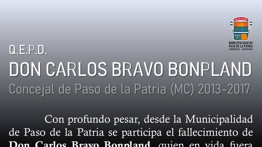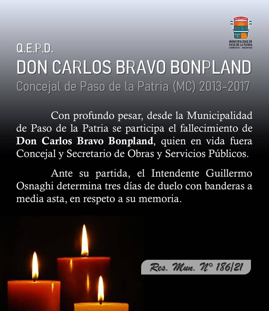 Con profundo pesar, la Municipalidad de Paso de la Patria participa el fallecimiento del Sr. Carlos Bravo Bonpland, quien en su oportunidad fuera Concejal y Secretario de Obras y Servicios Públicos municipales.