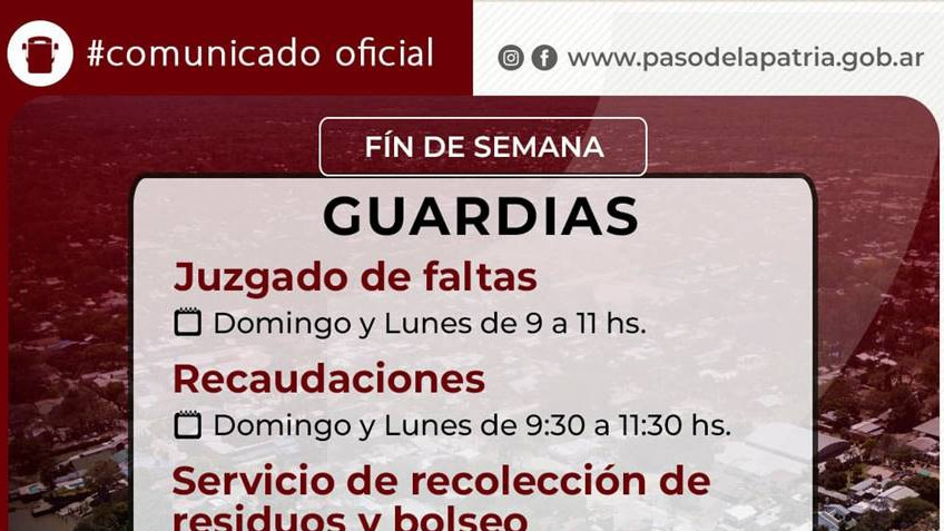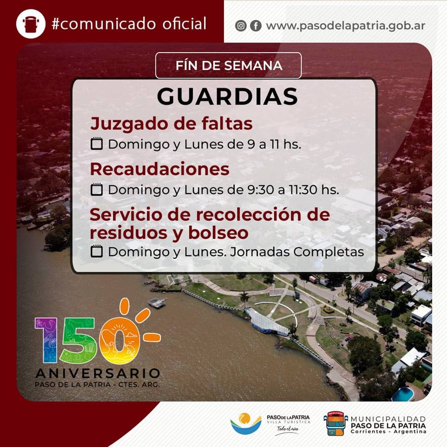 La Municipalidad de Paso de la Patria Informa las guardias de servicios y atención al público de este fin de semana largo.