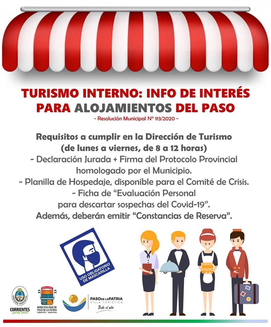 Disposiciones del Comité de Crisis de Paso de la Patria aplicables por parte de alojamientos locales en el marco de Turismo Interno en la provincia de Corrientes.