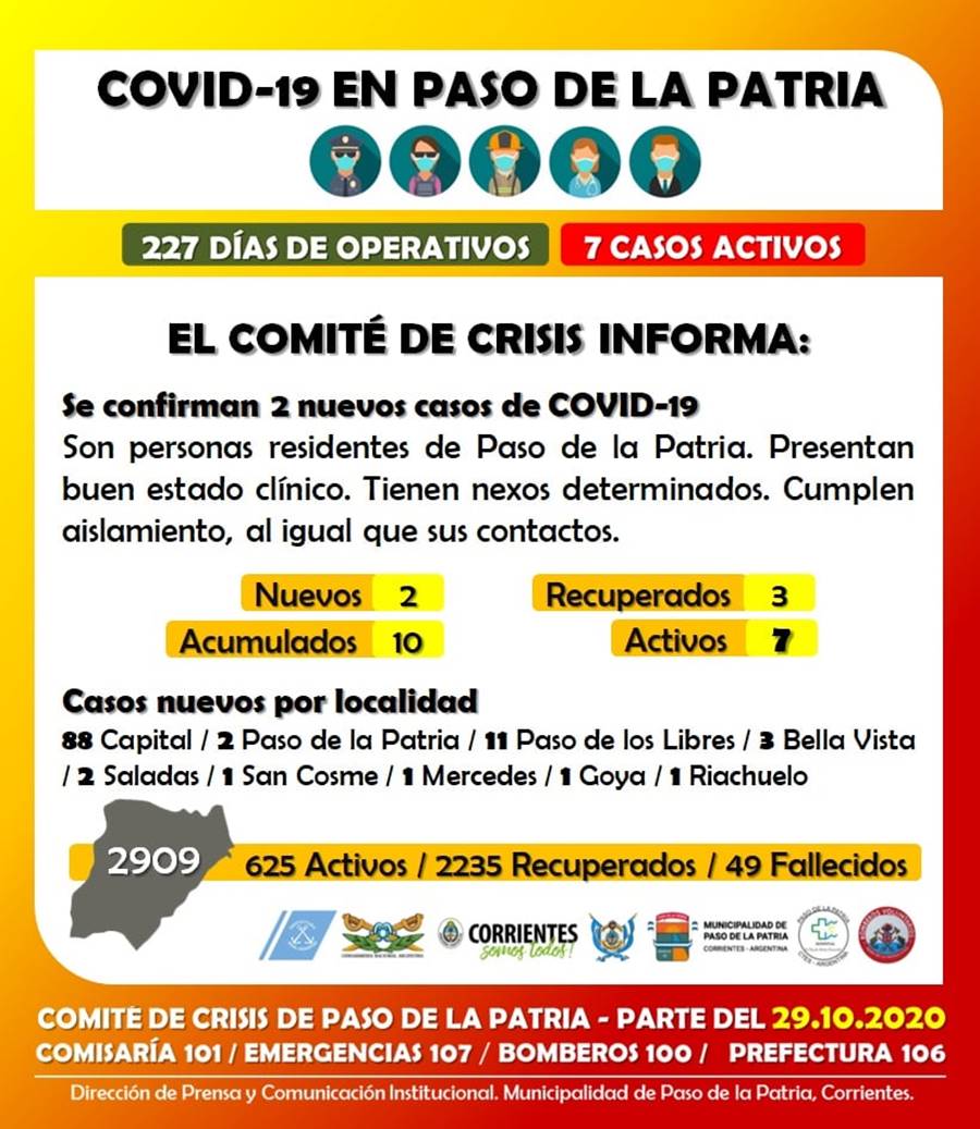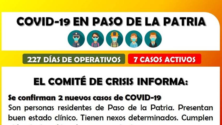 El Comité de Crisis de Paso de la Patria informa sobre la existencia de dos casos nuevos de Covid-19, se trata de personas residentes que presentan buen estado clínico con nexos determinados.