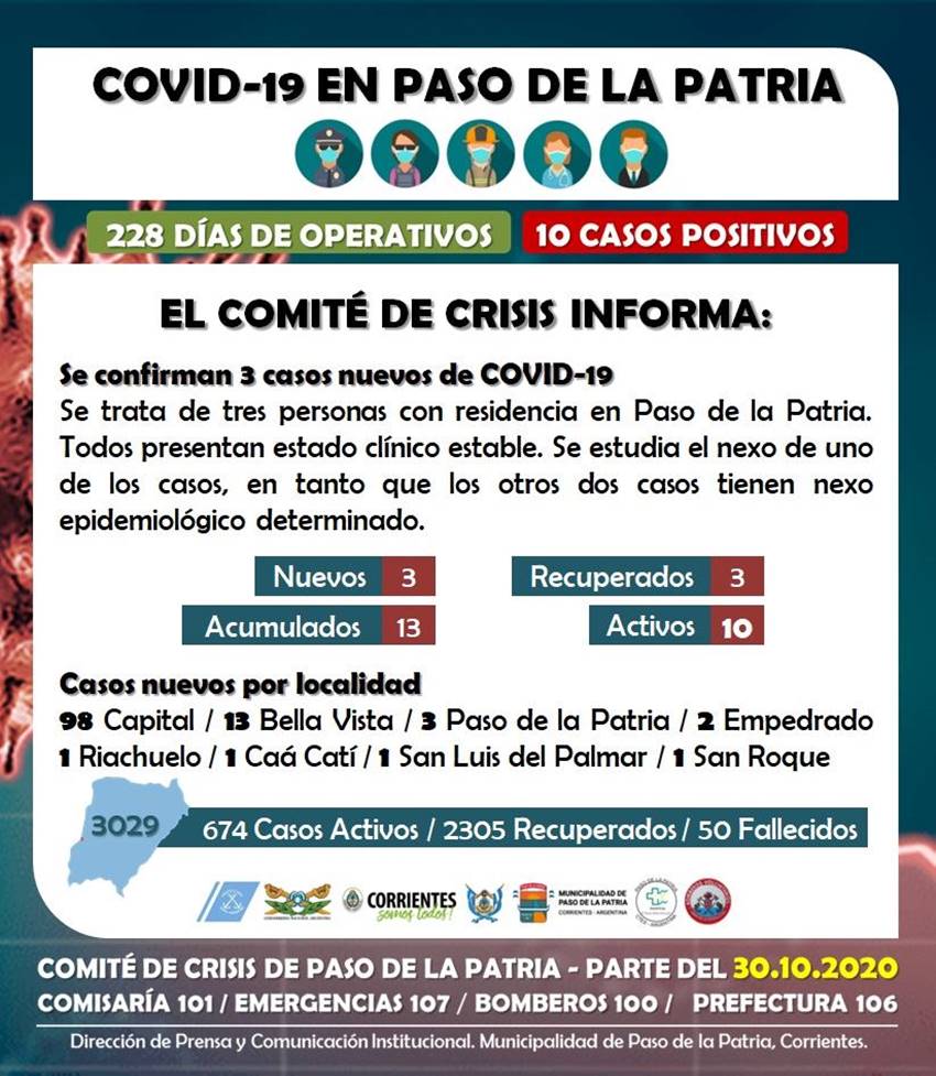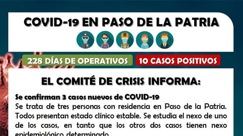 El Comité de Crisis de Paso de la Patria informa sobre la confirmación de 3 nuevos casos de Covid-19.