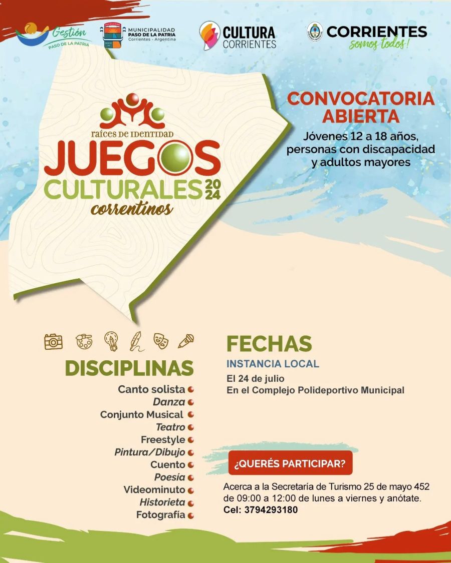 La Municipalidad de Paso de la Patria informa la apertura de la convocatoria para los Juegos Culturales Correntinos 2024.