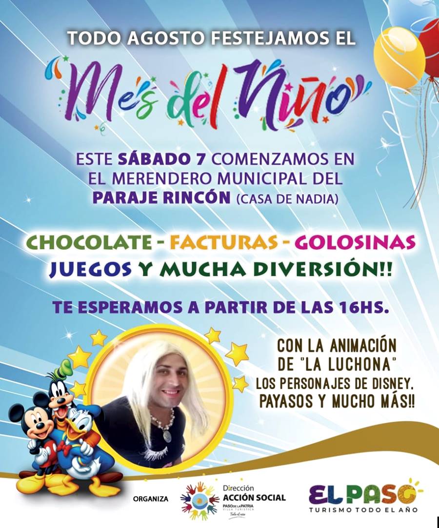 Personal de Acción Social, con el apoyo de otras áreas del Municipio, realizará durante todo el mes de agosto una serie de actividades alusivas al Día del Niño, que incluyen chocolate, facturas, golosinas, juegos y la animación de Enrique Maldini, personificando a “La Luchona”.