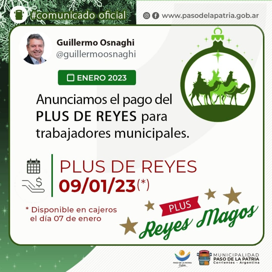 La actual administración municipal de Paso de la Patria que conduce el intendente Guillermo Osnaghi destina para la gran familia de trabajadores municipales otro plus, Plus de REYES MAGOS, así como se ha hecho en Navidad y Año Nuevo, también por día de Reyes.