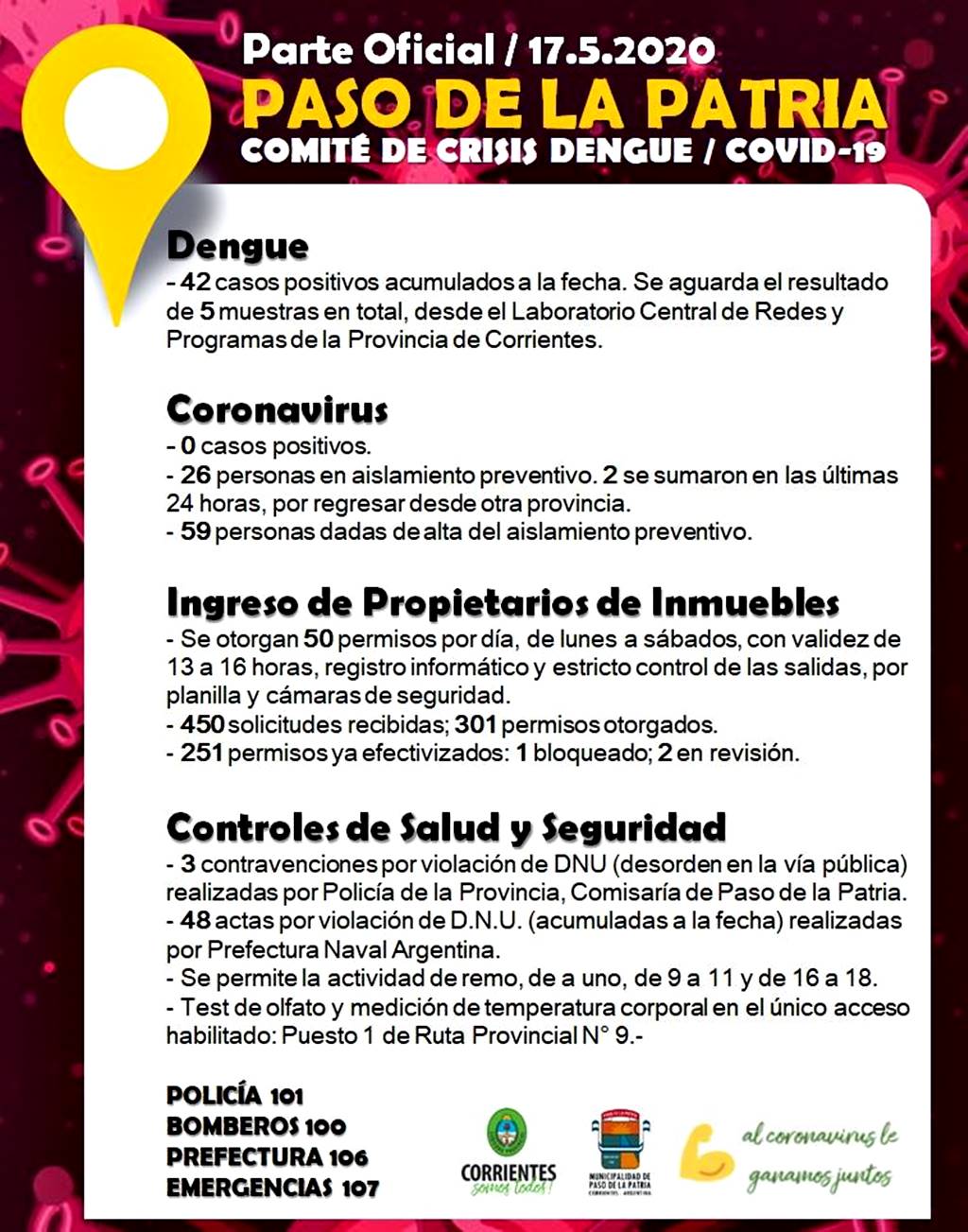 El Comité de Crisis de Paso de la Patria emitió información que corresponde al día de hoy, domingo 17/05/20.