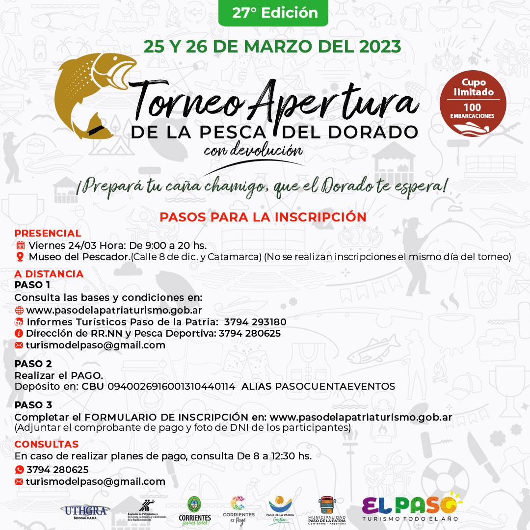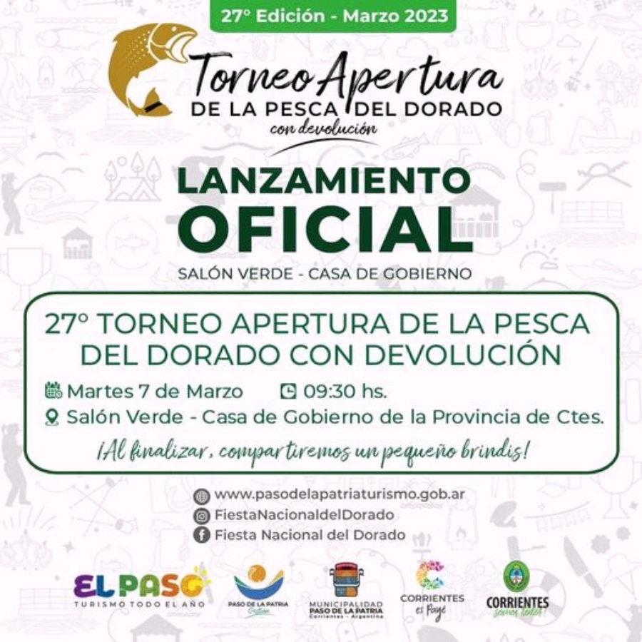 Este martes 7 de marzo, a las 9:30 horas, en el Salón Verde de Casa de Gobierno de la provincia de Corrientes se va a producir el Lanzamiento Oficial de la 27° Edición del Torneo Apertura de la Pesca del Dorado.