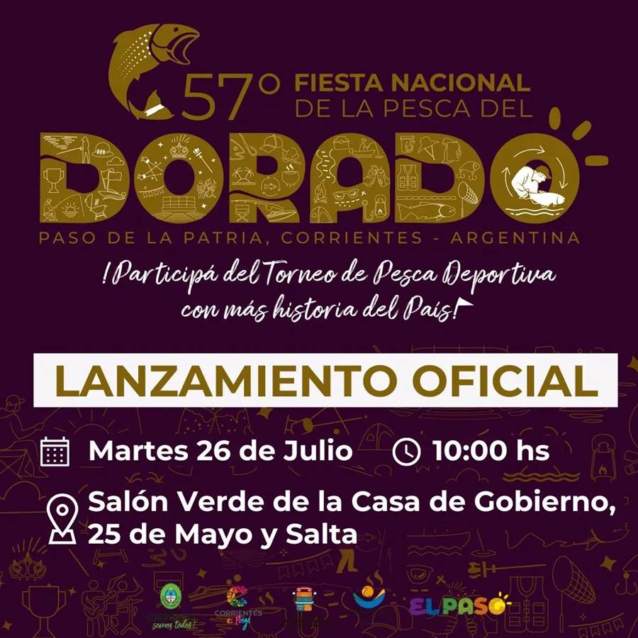 El próximo día martes, 26 de julio, en el Salón Verde de Casa de Gobierno, 25 de mayo esquina Salta de la ciudad de Corrientes, a las 10 horas, se va a producir el Lanzamiento Oficial de la 57° Fiesta Nacional de la Pesca del Dorado.