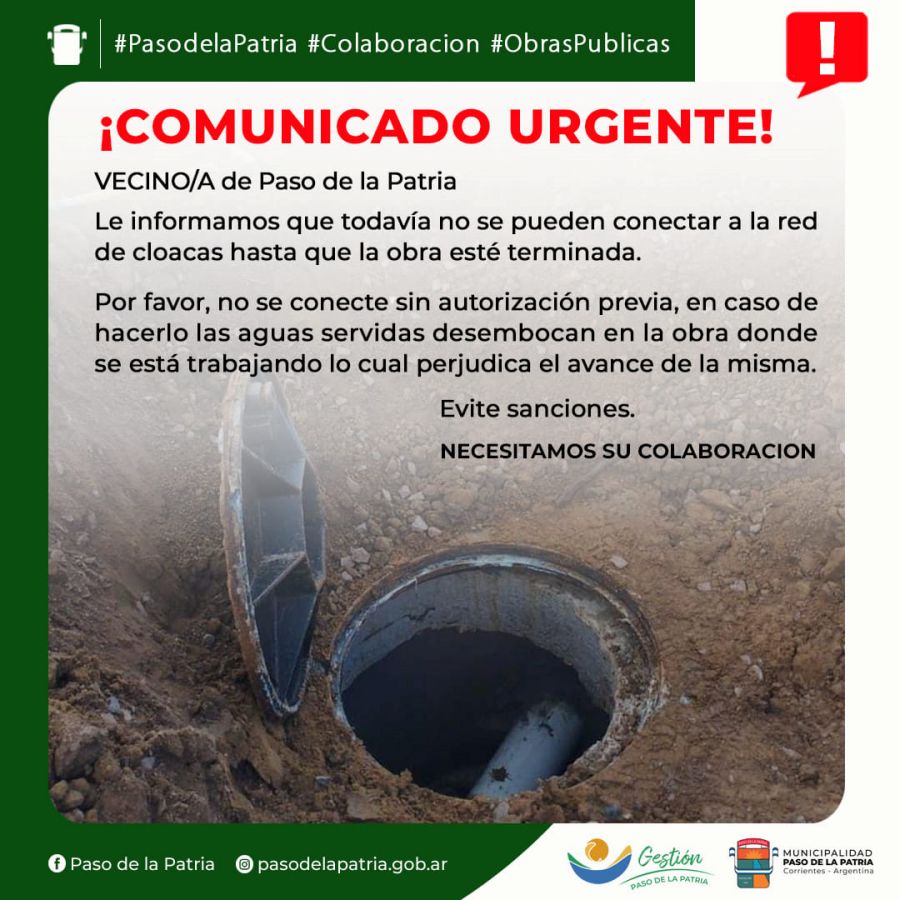 La Municipalidad de Paso de la Patria desea informar a los residentes que actualmente no se encuentran disponibles las conexiones a la red de cloacas, ya que la obra correspondiente aún no ha sido finalizada.