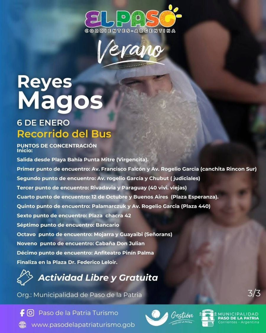 A partir de las 16:00 horas, los Reyes iniciarán su travesía marítima, maravillando a los visitantes con su llegada. Luego, a las 17:30 horas, continuarán su recorrido en el Bus Turístico, explorando diversos barrios de Paso de la Patria y compartiendo sonrisas y dulces.