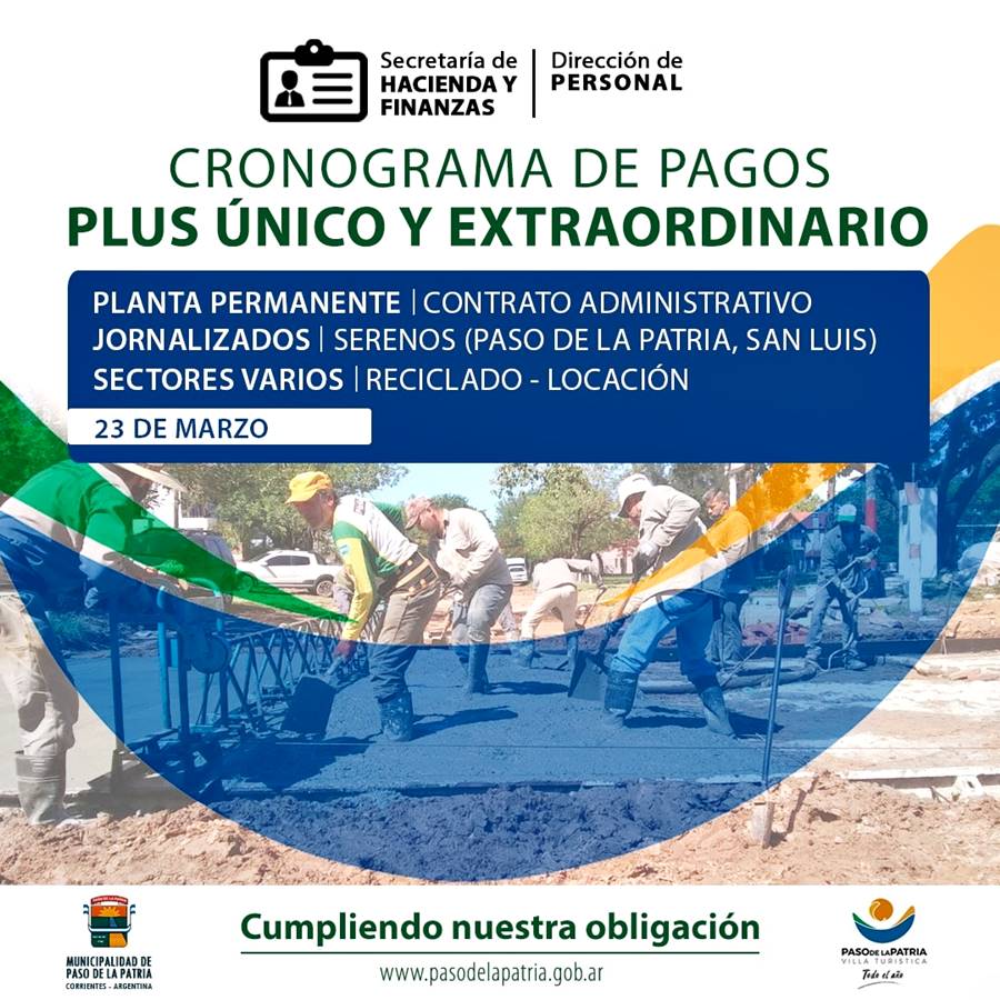 Así lo anunció la Secretaría de Hacienda y Finanzas de la Municipalidad de Paso de la Patria. Se trata de un pago extra no remunerativo de $1.000 para todos los trabajadores estables de la comuna, no incluye personal de temporada.