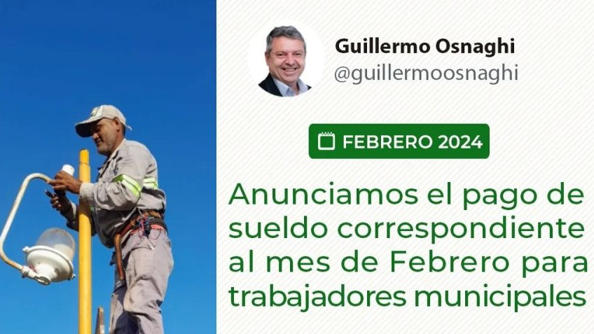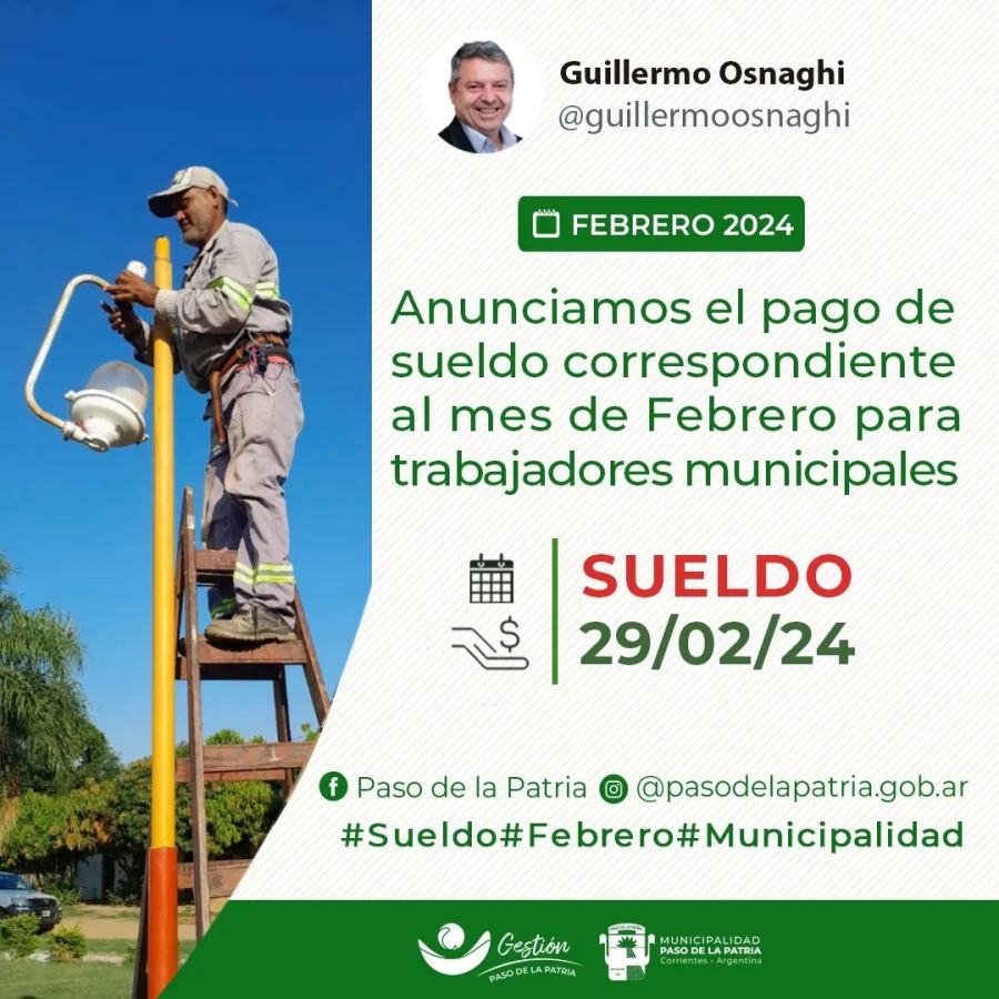 El arquitecto Guillermo Osnaghi, Intendente de la Municipalidad de Paso de la Patria, informa la fecha de pago de los sueldos correspondientes al mes de febrero de 2024 para los trabajadores municipales.