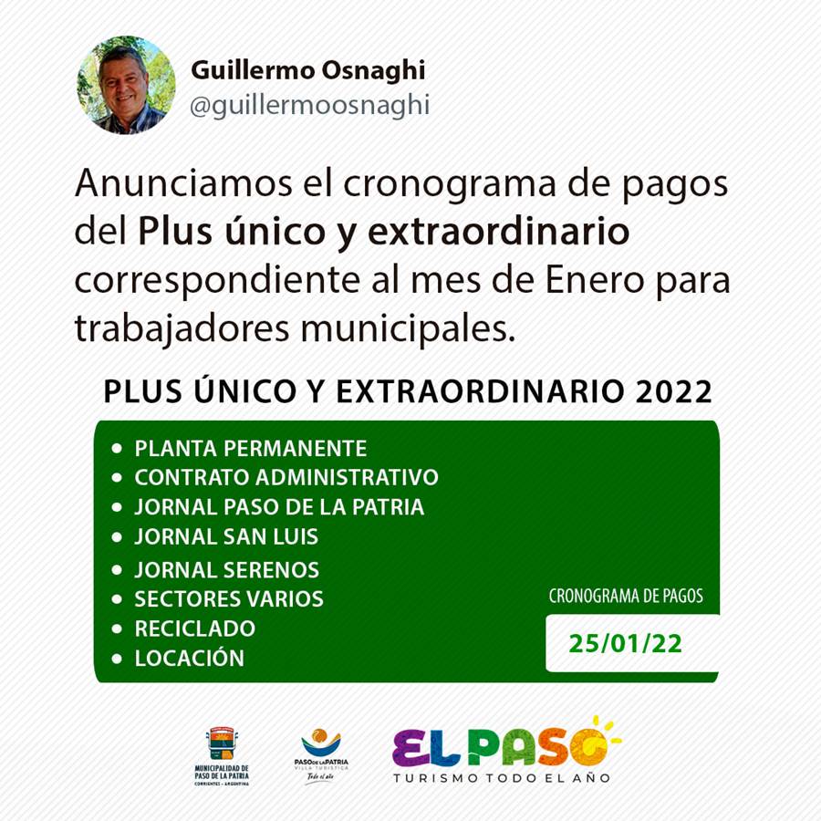 La Municipalidad de Paso de la Patria abonará un plus extraordinario a sus empleados en el mes de enero 2022.