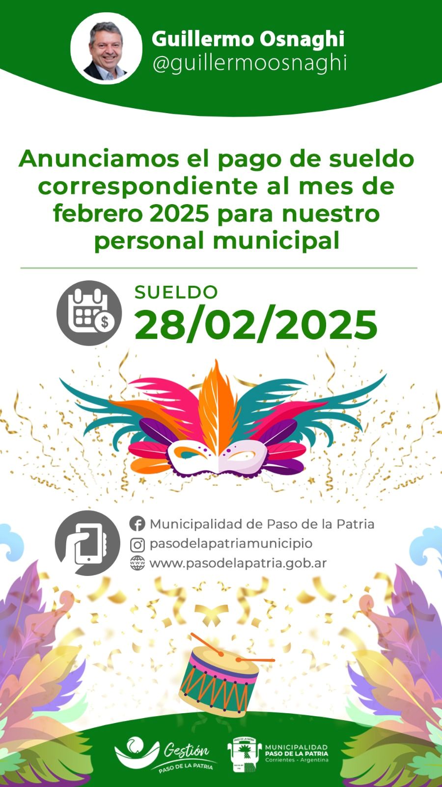 El Arq. Guillermo Osnaghi, Intendente de la Municipalidad de Paso de la Patria, informa que el pago de los salarios correspondientes al mes de febrero de 2025 se realizará según el siguiente cronograma: