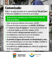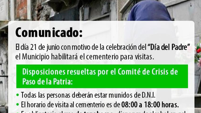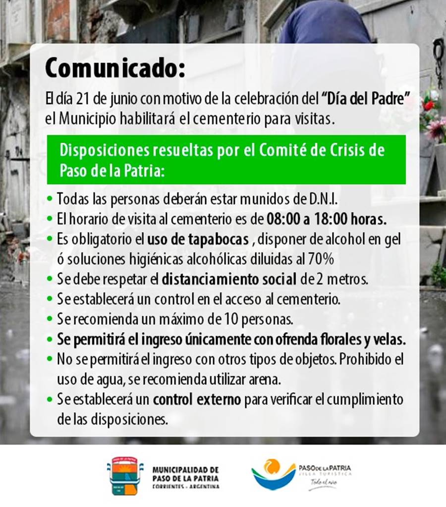 El día domingo 21 de junio, con motivo de la celebración del Día del Padre, el Municipio de Paso de la Patria habilitará el cementerio para visitas.
